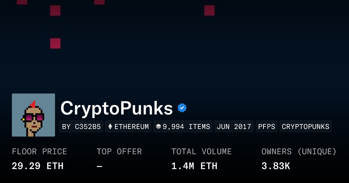 史上初(とされている)のNFTプロジェクトとして、AIによって自動でつくられた10000点に及ぶドット絵のコレクションです。2017年のローンチ時には無料配布されました。それが現在では平均で約4000万円です。